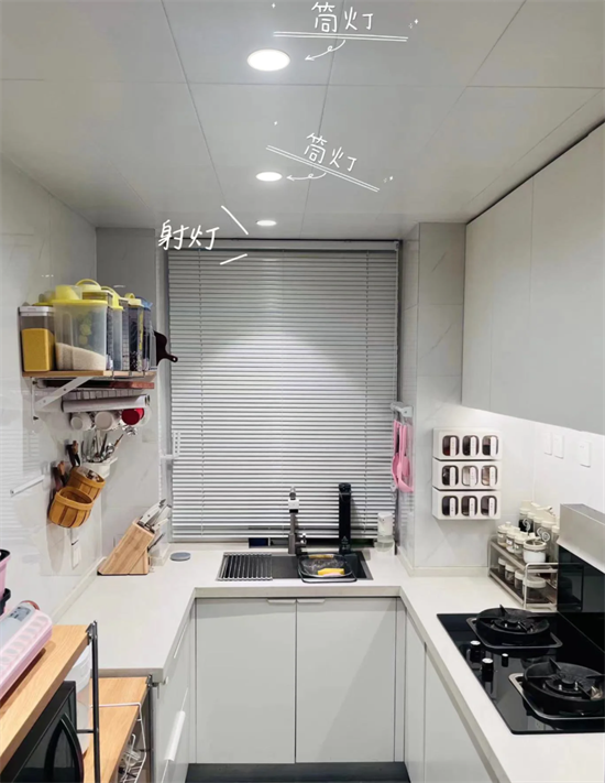 廚房除了基本的環(huán)境光之外,有兩個地方需要特別注意。一是洗菜盆上方,需要單獨安裝一盞射燈,光束角36°;另一個是切菜臺處,有吊柜就安裝線性燈,沒有就在頂面安裝射燈,以規(guī)避燈下黑的問題。