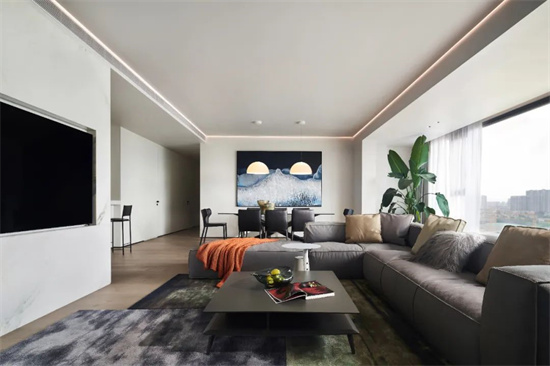 值得一提的是,房間另一側(cè)的大窗戶設(shè)計(jì),不僅增加了空間的采光與通風(fēng),更將室外的城市天際線引入室內(nèi),使得整個(gè)空間與外部環(huán)境相互交融,營造出一種開放而自由的氛圍。