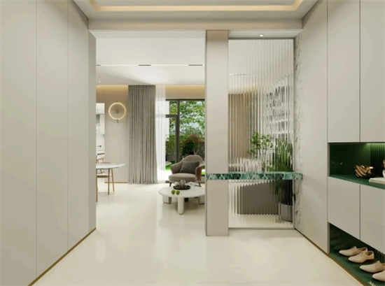 玄關(guān),是本案設(shè)計(jì)的亮點(diǎn)之一。設(shè)計(jì)師圍繞 “功能與藝術(shù)”上演了一場空間對話的故事情節(jié)。整個(gè)玄關(guān)的設(shè)計(jì)像一幀幀電影的畫面,極具藝術(shù)美感和感染力。內(nèi)置收納玄關(guān)柜,與自然質(zhì)感的材質(zhì)虛實(shí)結(jié)合,輔以燈光的適度渲染,當(dāng)走進(jìn)門廳的剎那,便可領(lǐng)略出屋主不俗的品味??臻g的高級(jí)感無需靠堆砌來完成,適當(dāng)?shù)牧舭资歉唠A的呈現(xiàn)。柔美的流線型設(shè)計(jì),保留整體空間的大氣簡潔又不失質(zhì)感美學(xué)格調(diào)。