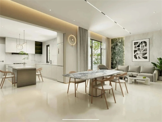 客餐廳做了開放式布局,合理的動(dòng)線規(guī)劃使得整體活動(dòng)空間通透明亮。以簡約為主線的著名無主燈品牌設(shè)計(jì)搭配大理石的合理運(yùn)用,為整個(gè)空間塑造出奢華優(yōu)雅氛圍感。沙發(fā)背景墻采用綠色為主基調(diào),透過巨大玻璃窗,與自然元素彼此融合。