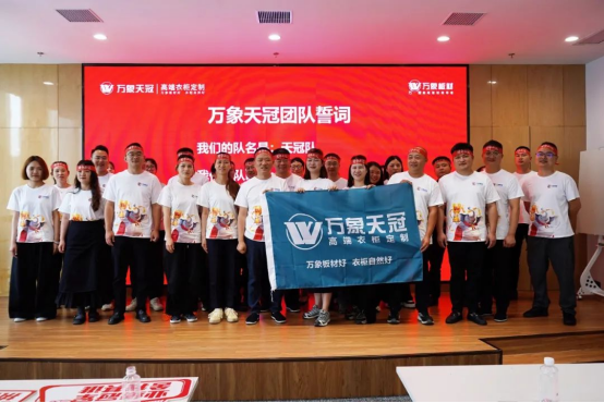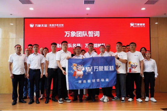 旺德府木業(yè)公司總經(jīng)理唐勇先生帶領(lǐng)萬象天冠品牌戰(zhàn)隊進(jìn)行宣誓,旺德府家居產(chǎn)業(yè)集團(tuán)總裁王仲豐先生授予象征團(tuán)隊榮譽(yù)的沖刺戰(zhàn)旗。