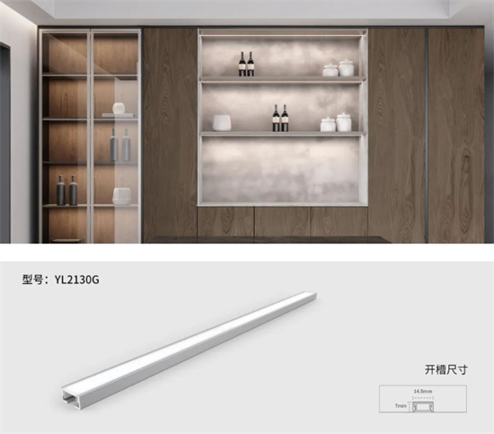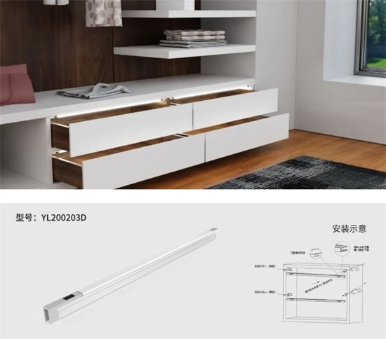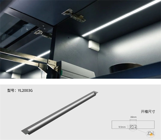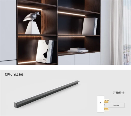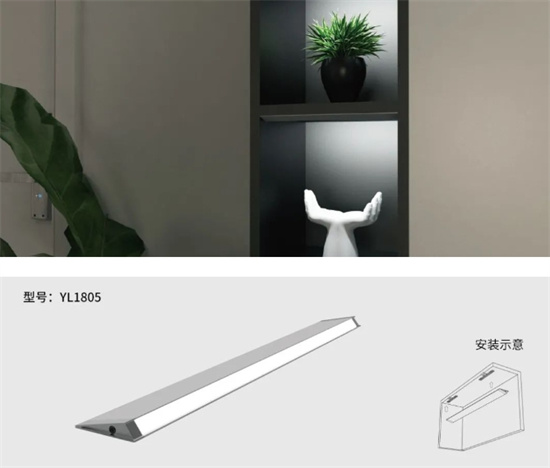 流線型設(shè)計(jì),此款燈體金屬質(zhì)感強(qiáng),氣質(zhì)厚度沉穩(wěn),安裝方式為開槽嵌入式安裝,融入柜體中,真正的無 縫安裝。嵌入柜體中照明,光線充滿柜內(nèi),柔和護(hù) 眼。另此款產(chǎn)品可定制手掃感應(yīng)款。