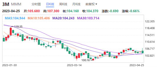 受消息影響,3M今日股價(jià)下跌0.66%至104.42美元/股;目前總市值為575.84億美元。
