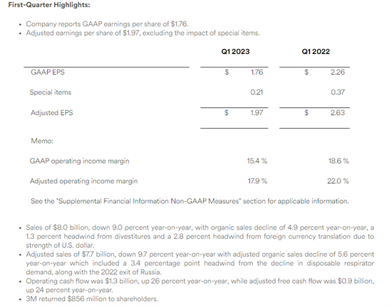 財(cái)報(bào)顯示,該公司2023財(cái)年第一季度實(shí)現(xiàn)營(yíng)收80.31億美元,對(duì)比去年同期的88.29億美元,同比減少9.04%。公司表示,其中3.4個(gè)百分點(diǎn)的下降是由于一次性口罩銷量下降以及公司2022年退出俄羅斯市場(chǎng)導(dǎo)致。