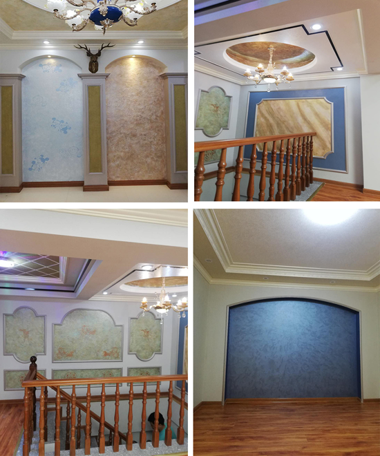 肌理壁膜墻面、藝術(shù)水漆墻面、幻彩砂系列墻面、仿古擦色造型、仿大理石、曼珠沙華、布紋、壁布墻面、雅晶石等等的藝術(shù)涂料樣板,讓人目不暇接、廣開視野。