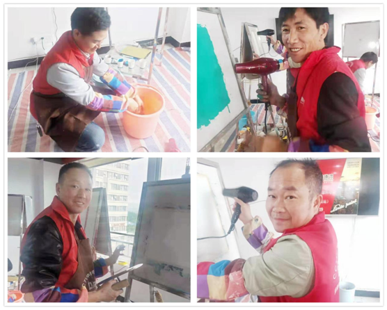 在學(xué)員們親自上陣的環(huán)節(jié)中,各位學(xué)員一絲不茍、認(rèn)真操作,不遺漏每一個步驟、不放過每一個細(xì)節(jié),精益求精、全情投入到練習(xí)當(dāng)中。學(xué)員通過資深藝術(shù)涂料工程師的細(xì)心指導(dǎo)和自己大膽的嘗試,紛紛獨立完成了理想的藝術(shù)作品,掌握了藝術(shù)涂料的施工技能和色彩搭配等知識。